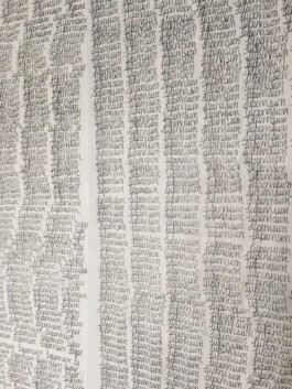Leere Straßen. Ein großes graues Haus gleitet einsam durch die neblige Landschaft. In seinem Bauch tausendfach die Worte MONUMENT, SUBLIMINAL und SUPERVISION. Panoptisch multipliziert. Ein flirrendes Grid, das sich über die Wände zieht. Wörter, hintereinanderweg, endlos in Schleife geschrieben. Reproduziert und tapeziert. Rundum. Die fliesenartige Struktur löst die Architektur auf und produziert beklemmende Klaustrophobie in deren Weitläufigkeit. Das Mikro der Handschrift verliert sich in dem Makro seiner Reproduktion.
