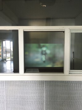 Der soziale Raum ist untrennbar verbunden mit dem privaten Raum: Eine Glasscheibe in der Wand lässt nach nebenan blicken. Dahinter, abschlossen, auf Stoff gedruckt, das zum Portrait vergrößerte Passfoto der Künstlerin Paula Niño Ramirez. Ein unglaubwürdiges Monument, gleichzeitig groß und unsichtbar. Noch da und nicht mehr.
