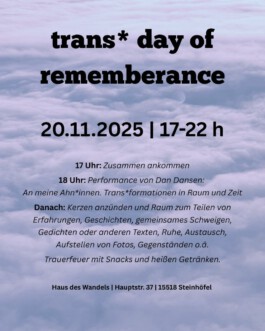 Explizit eingeladen sind alle Trans*Menschen und alle Leute, die Trans*-Menschen verloren haben. Freund*innen, fam und Verbündete sind sehr willkommen!